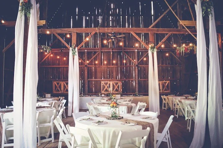 800 square foot newly remodel bridal barn space that is heated and cooled with soft seating, changing room, vanities, white washed wood walls, several white paned windows, French countryside lighting, large open space